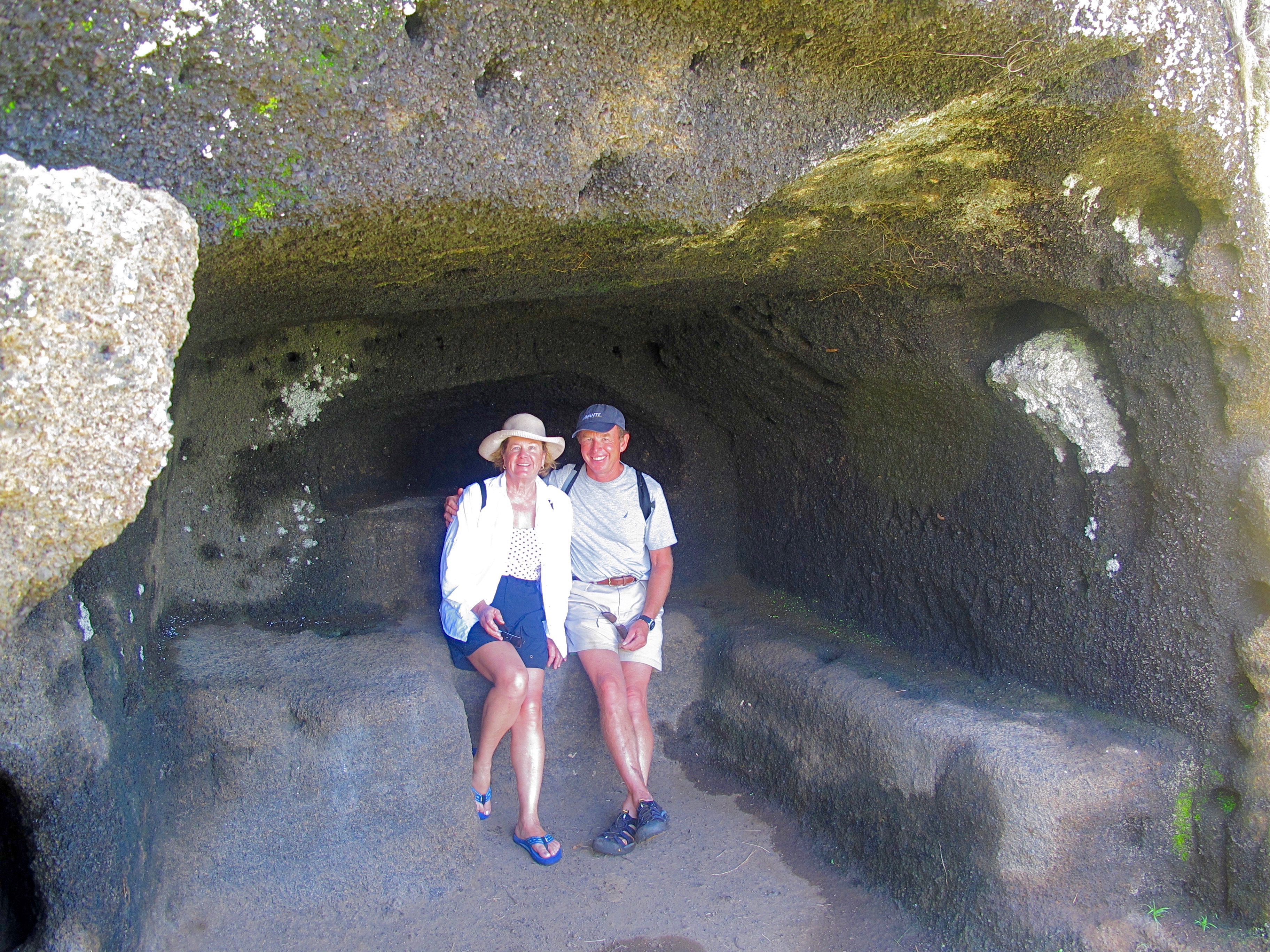 On the passage to the Galapagos, The First Mate had read a book entitled “Floreana”, the story of the Wittmer family from Germany who arrived on the island in 1932. They first set up home in a pirate cave while they were constructing their home. A much anticipated highlight of the trip for The First Mate is seeing this cave. What a shocking surprise it turns out to be! Cave? It is more like a shallow indent in the side of a hill. How could they have ever kept themselves and their belongings dry in the frequent rains up here? Margret Wittmer arrived here 3 months pregnant. How did they and that baby ever survive?