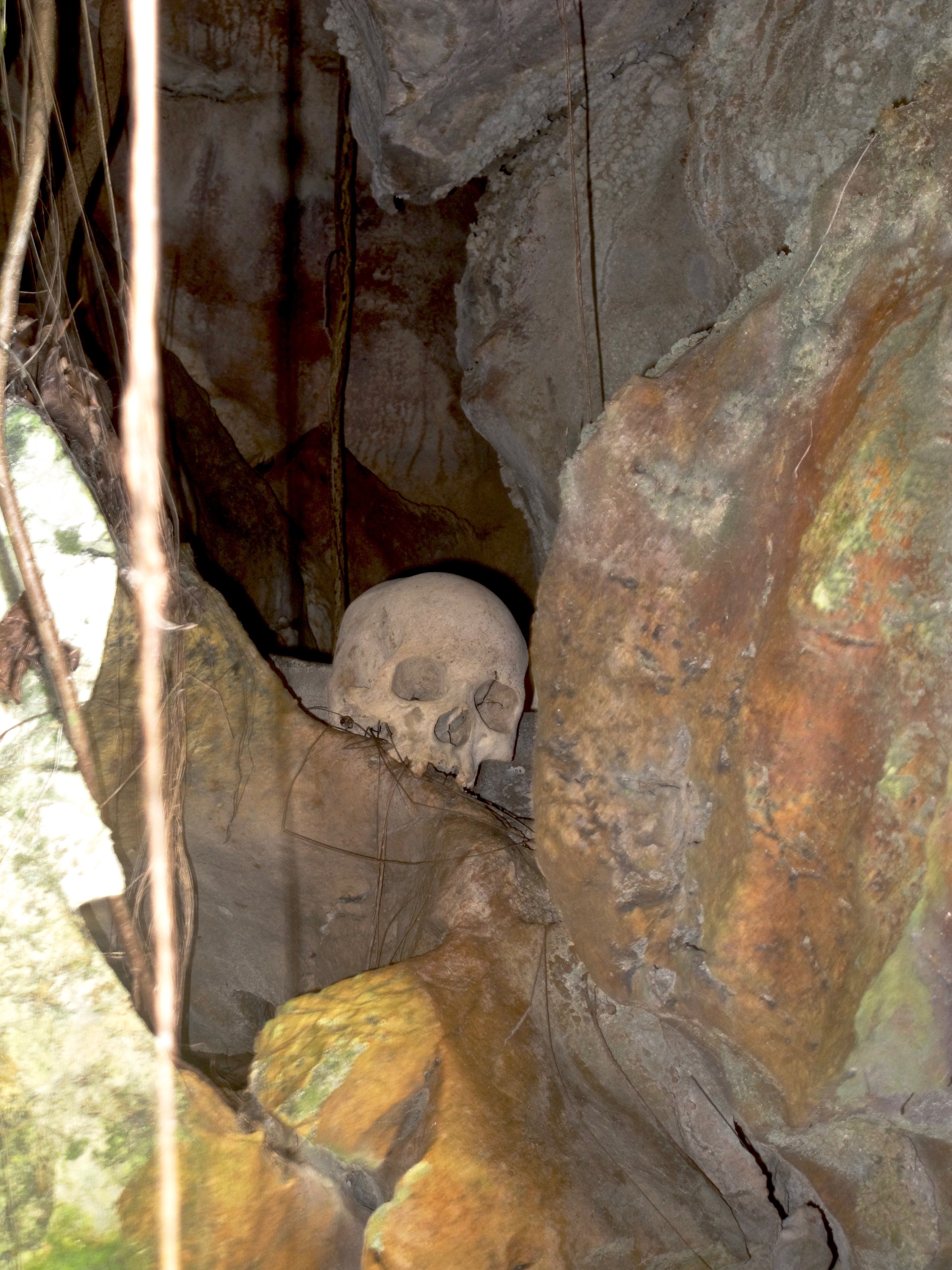 Narrow and rising upward, the cave itself only has room for a few of us at one time.  Not knowing what to expect, we climb inside.  Skulls are lodged in nooks and crannies.  Several rest together in a recessed corner with other skeletal bones and what look like chards of pottery.