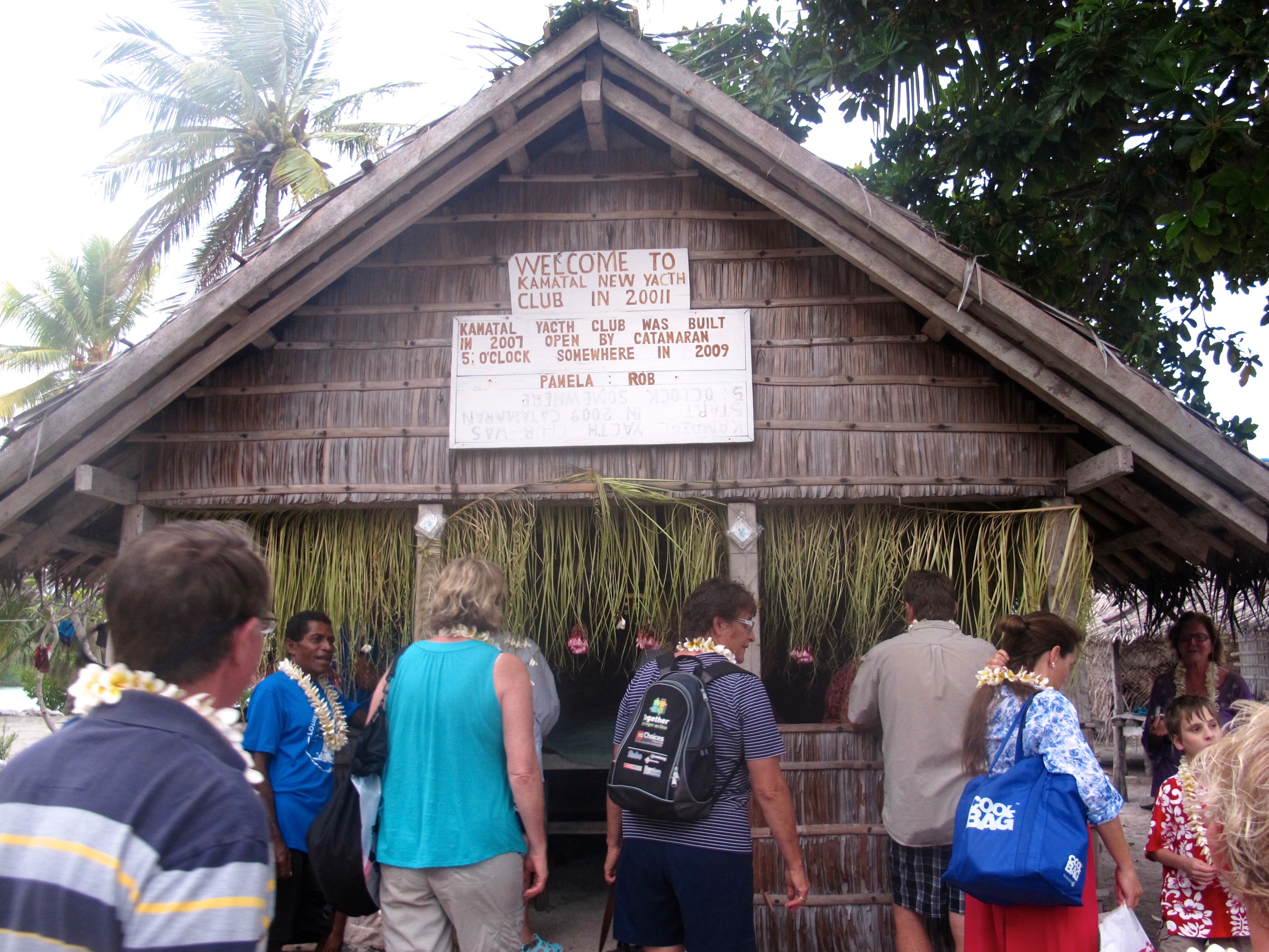 Jimmy, the owner of the island and founder of the Kamatal Yacht Club, is not one to be deterred by approaching storm clouds as he paddles out from shore in his kayak.  He is a friendly, talkative man who welcomes us to his island and the Kamatal Yacht Club.  We are free to come ashore, meet whomever of his family is around and tour the place.  He asks us to sign the yacht club guest book.  We glue one of our photos of Avante positioned between two icebergs into the book and then sign our names.  On an isolated, energy- and water-deprived island here in the Pacific, an ice cube is an unknown thing.  Jimmy is astounded at the size of the icebergs and delighted to have the photo in his book.   He proudly announces that the club “restaurant” will be open tomorrow night.  Would we like to make a reservation?  There is no cost.  Maybe a donation would be nice, and do bring your own beverage.  Fearing the worst, The First Mate questions the menu.  Not pig, please!  Grilled fish, she is told.  Relieved, we quickly add our names to the reservation list.
